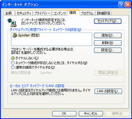 「接続」タブをクリックしてください。ダイヤルアップ接続の方は「設定(S)」ボタンを、ブロードバンド接続の方は「LANの設定(L)」ボタンをクリックしてください。