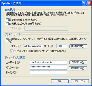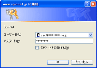設定完了後、SpinNetホームページ(http://www.spinnet.jp/)等にアクセスすると認証画面が表示されますので、以下のように入力して「OK」ボタンをクリックしてください。
