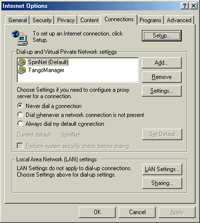 Click on "Connections" tab. Click "Settings" button for dial-up connection, click "LAN Settings" button for broadband connection.