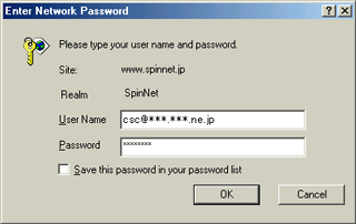 After finished the settings, access to SpinNet site(http://www.spinnet.jp/indexe.html)or other sites, then the authentication window will open. Enter as follows, then click "OK" button.